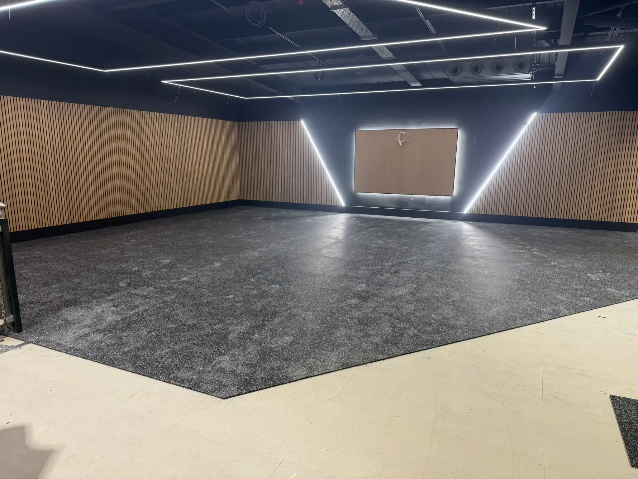 Around the perimeter of the gym, we laid carpet tiles for a clean, professional look that also offers acoustic benefits. In the changing and wet areas, we fitted safety vinyl flooring to ensure slip resistance and hygiene. We also installed luxury vinyl tiles (LVT) in select zones for a high-end finish that balances durability with design. The result was a seamless, high-performance flooring system tailored to every area of the gym. Need tough, tailored flooring for your gym? Let’s build a system that performs in every zone.